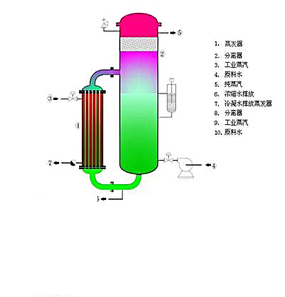 合格的原料水由多级泵增压后经流量计进入预热器,经热交换后温度可比蒸发器加热蒸汽低10-15℃, 然后进入在蒸发器经料水分配器喷射在加热管内壁,使料水在管内成膜状流动,被锅炉蒸汽汽化,产生的夹带水滴的二次蒸汽,从加热管下端进入三级分离装置,被分离后生成纯蒸汽。可以在线检测纯蒸汽冷凝水的电导率,从而检验纯蒸汽是否合格。锅炉蒸汽的蒸发器被原料水吸收热量冷凝后,凝结成锅炉蒸汽凝结水,作为预热